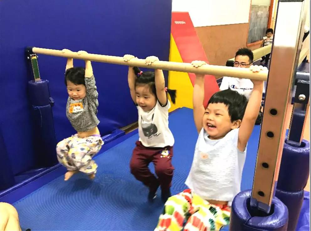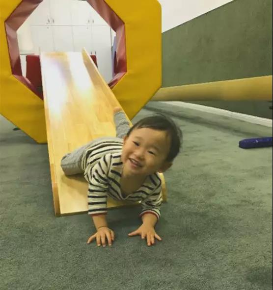 夏诺属于观察型小孩,刚加入一个新环境不会哭闹但是也不主动,基本是静默地在一旁观察。刚开始的几节课夏诺基本就是在观察中度过的,很认真地看着老师,不动不闹。随着上课次数增多,夏诺对老师和环境渐渐熟悉起来,慢慢跟上了老师的动作,并且完成得很好,甚至回到家听到课堂上相同的音乐也会重复老师的动作。于是,我们一直坚持上健身课直到现在。夏诺现在已经上到健身5,可以在教具上爬上滑下,翻越障碍,穿过隧道,可以在蹦床上自如地蹦跳(还记得刚开始上蹦床还不会跳呢,双腿直立不会弯曲,直到一天在家里突然就掌握了要点,可以腾空而起了。我们为她的成长喜悦,她也是相当有成就感啊),还可以放开双手走平衡木了!在这儿要非常感谢Eva,Jackson,Maggie几位老师。