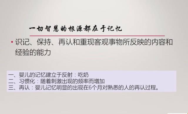 举个例子,2岁半之前的孩子是最初期的记忆,虽然看起来心不在焉,但实际也在进行无意识的记忆。但2岁半之后孩子才慢慢具备有意识记忆的能力,我们才要培养孩子的记忆力习惯。