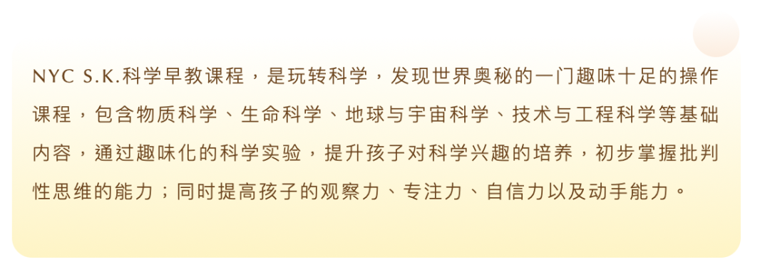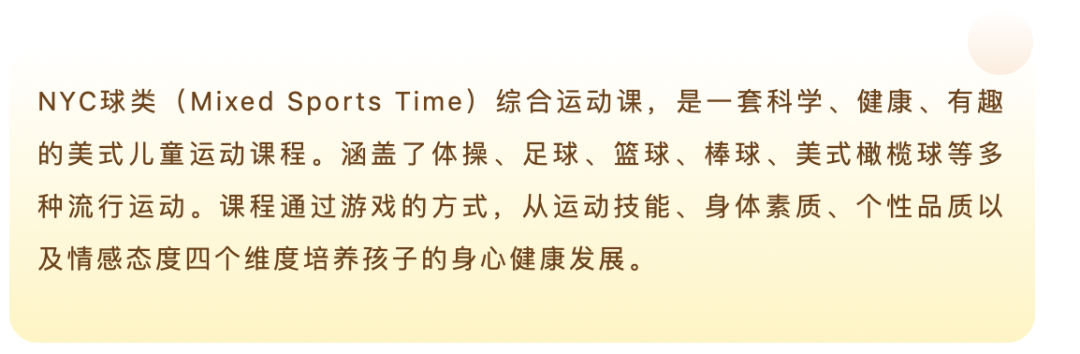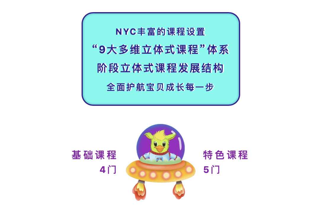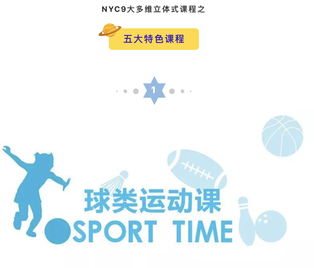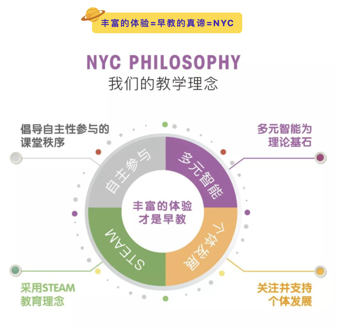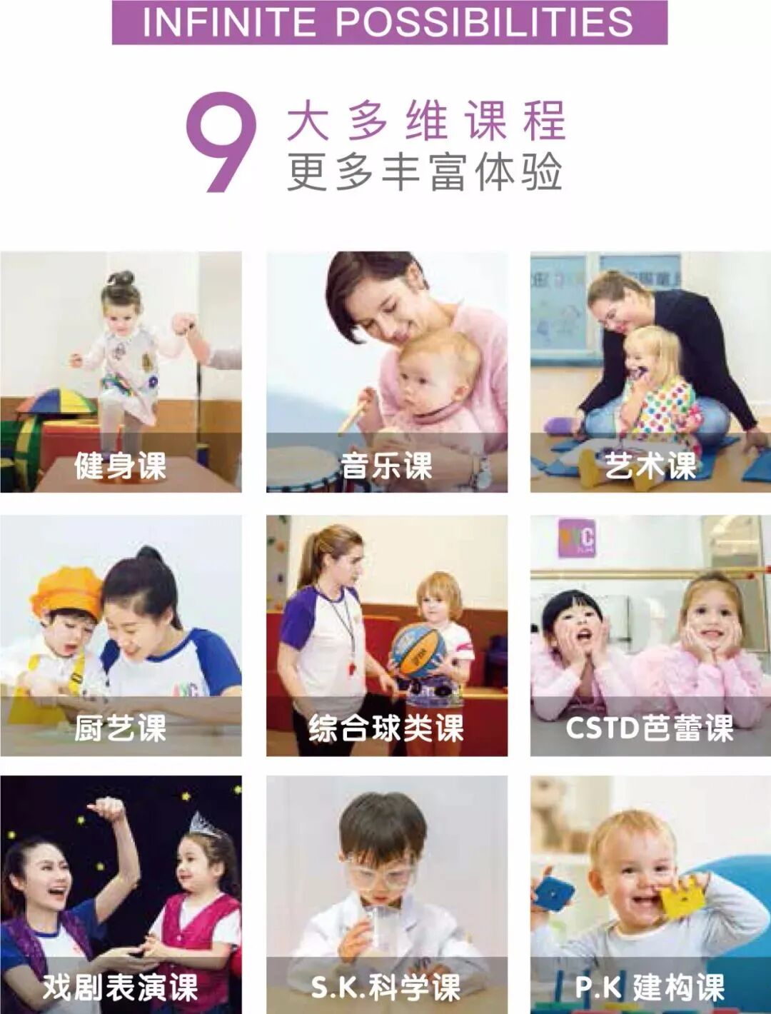 NYC依托霍华德·加德纳博士的多元智能理论,特设健身、音乐、艺术、厨艺四大核心基础课程 ; 芭蕾、综合球类、音乐剧表演、P.K.建构、S.K.科学五大特色学期制课程,课程种类丰富、综合、专业,教具多达1000余种,教学活动多达2300余个,不仅代表着儿童早期教育行业的高标准,更是全球儿童运动技能、智力发展、社交能力及创新探索能力发展的先行者。