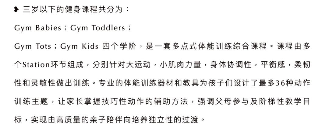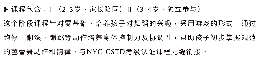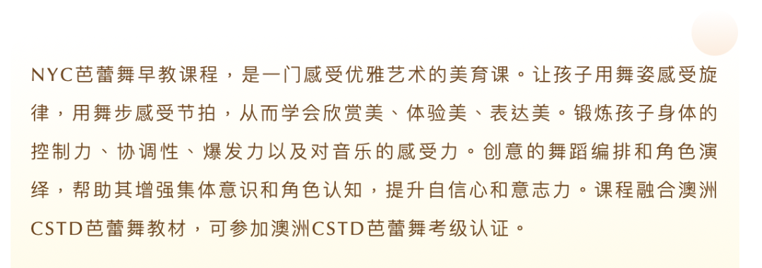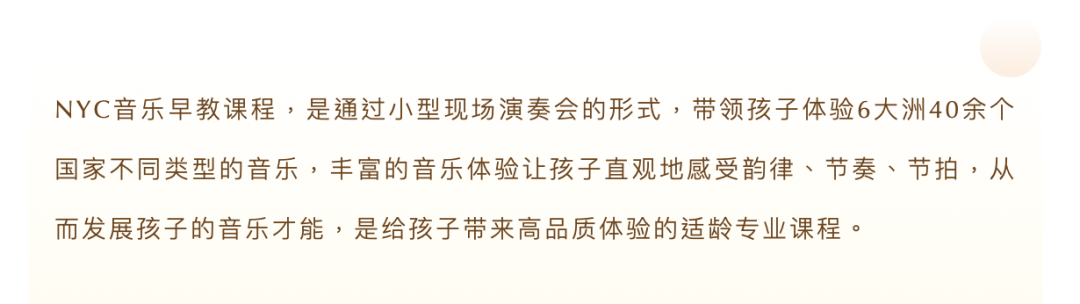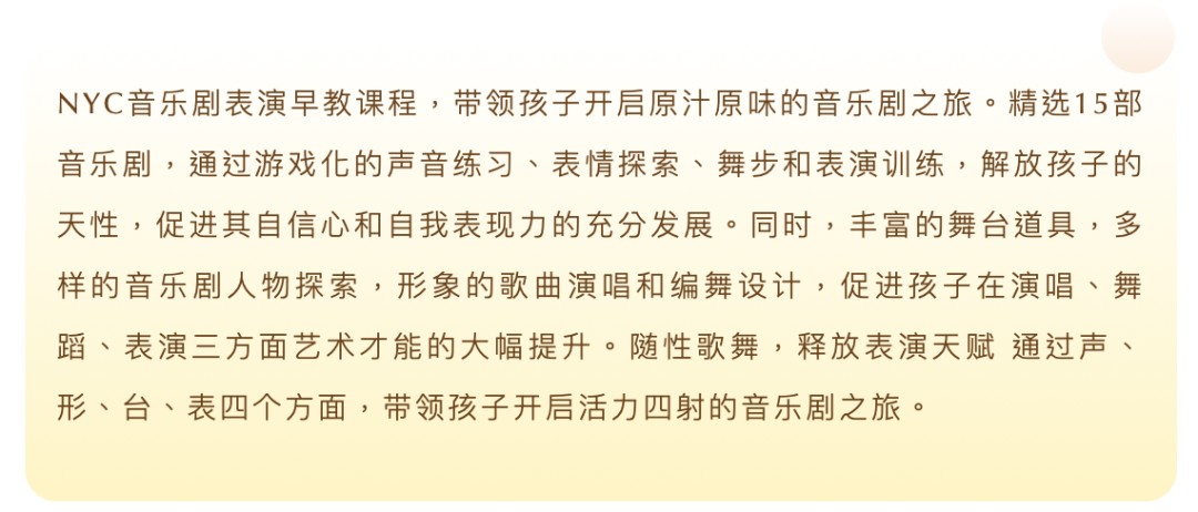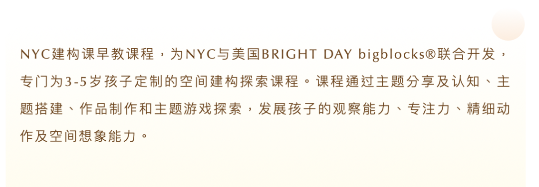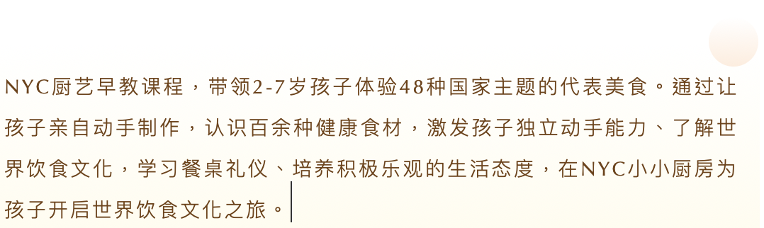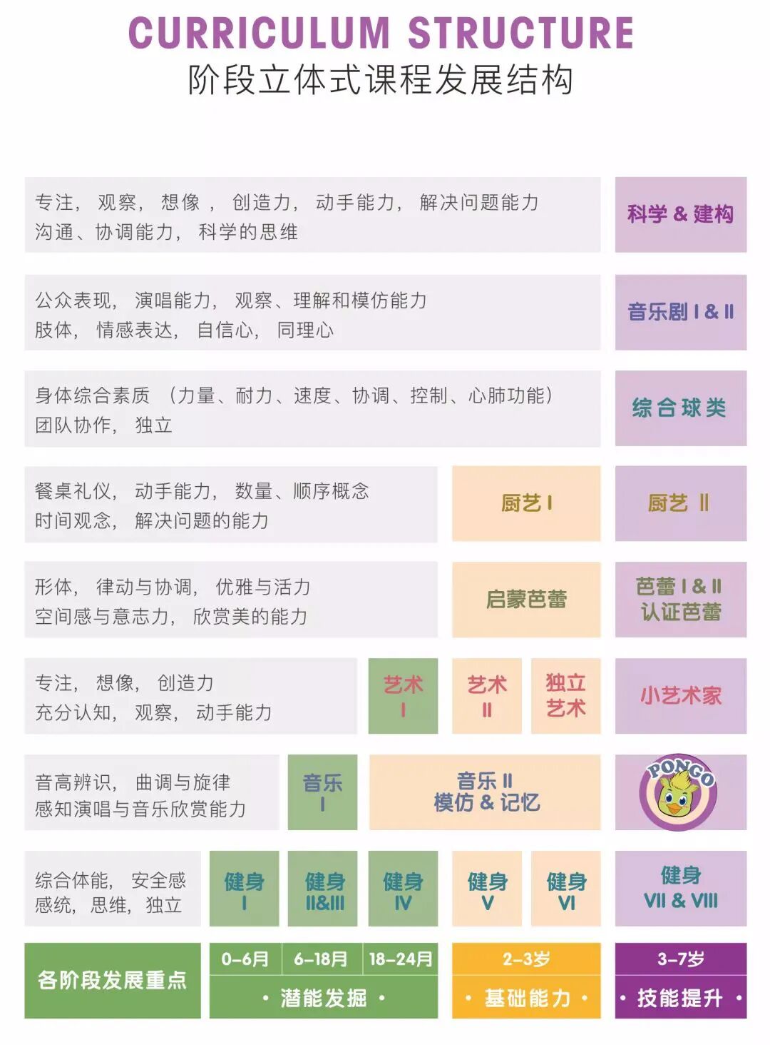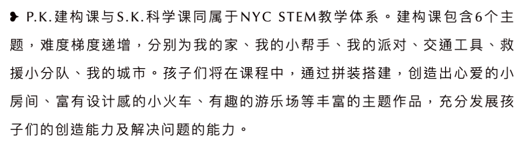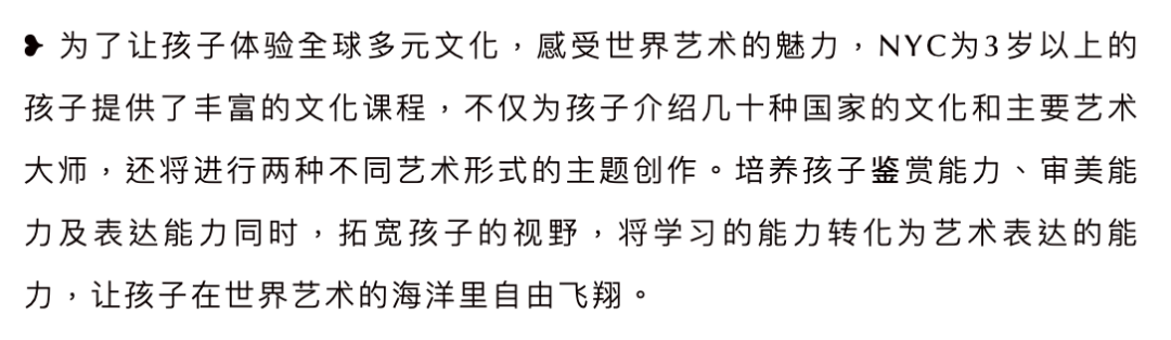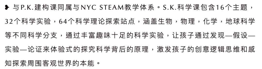 NYC依托霍华德·加德纳博士的多元智能理论,特设健身、音乐、艺术、厨艺四大核心基础课程 ; 芭蕾、综合球类、音乐剧表演、P.K.建构、S.K.科学五大特色学期制课程,课程种类丰富、综合、专业,教具多达1000余种,教学活动多达2300余个,不仅代表着儿童早期教育行业的高标准,更是全球儿童运动技能、智力发展、社交能力及创新探索能力发展的先行者。