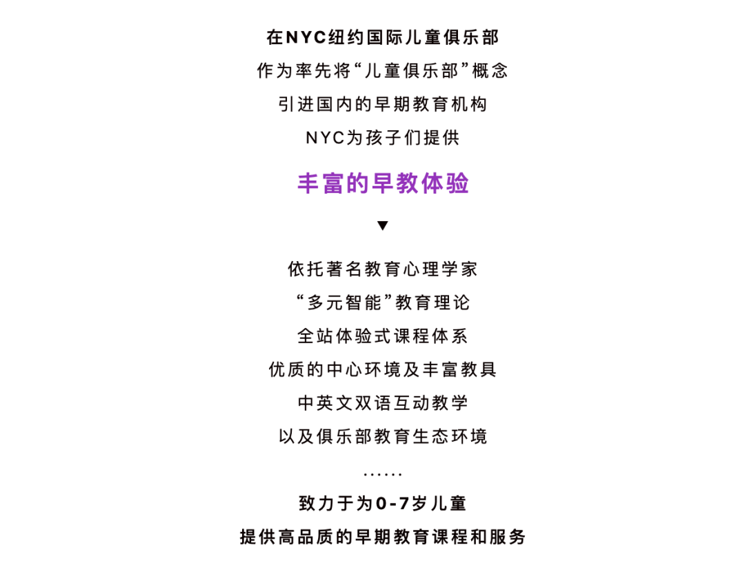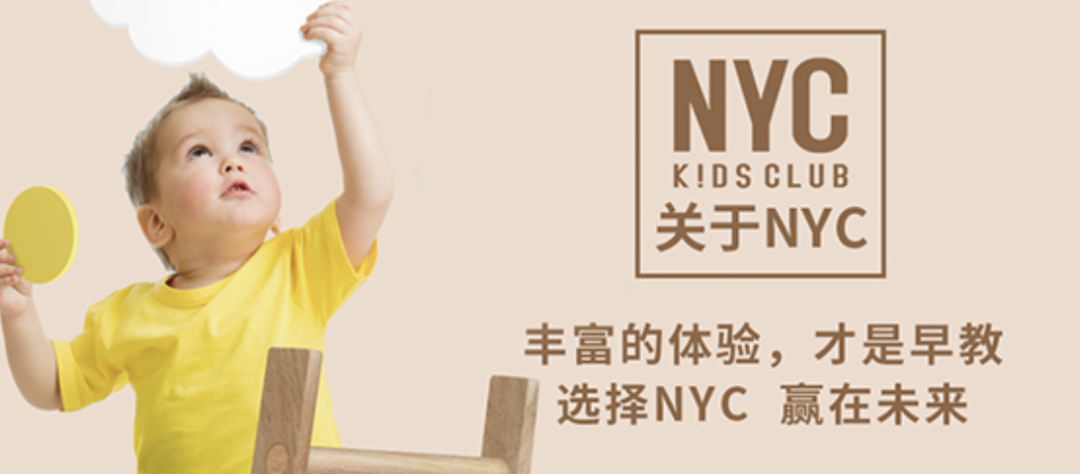 NYC纽约国际儿童俱乐部(NEW YORK CITY KIDS CLUB),起源于美国纽约,2012年进入中国,是纳斯达克上市公司瑞思(RISE)战略投资的一家打通0-18岁的一体化教育机构。作为率先将“儿童俱乐部”概念引进国内的早教品牌,NYC打造更高品质的教学环境、服务、课程及亲子共同成长的“全体验式早教“俱乐部平台。致力于为全球0—7岁儿童及家庭提供高品质的早期教育课程和早期教育服务。