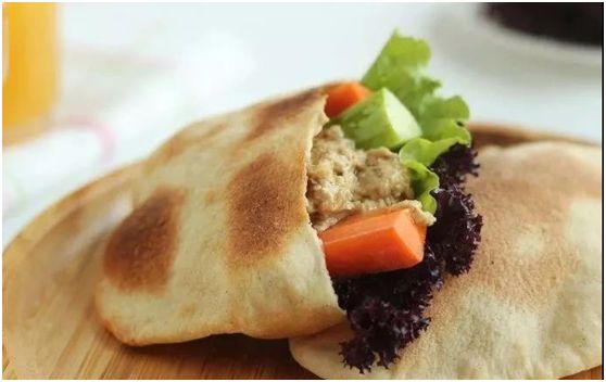 全麦皮塔饼和鹰嘴豆泥(Hummus with whole wheat pita)是完美的搭配,很多阿拉伯人用皮塔饼蘸著鹰嘴豆泥吃就是一顿最常见的饭餐了。